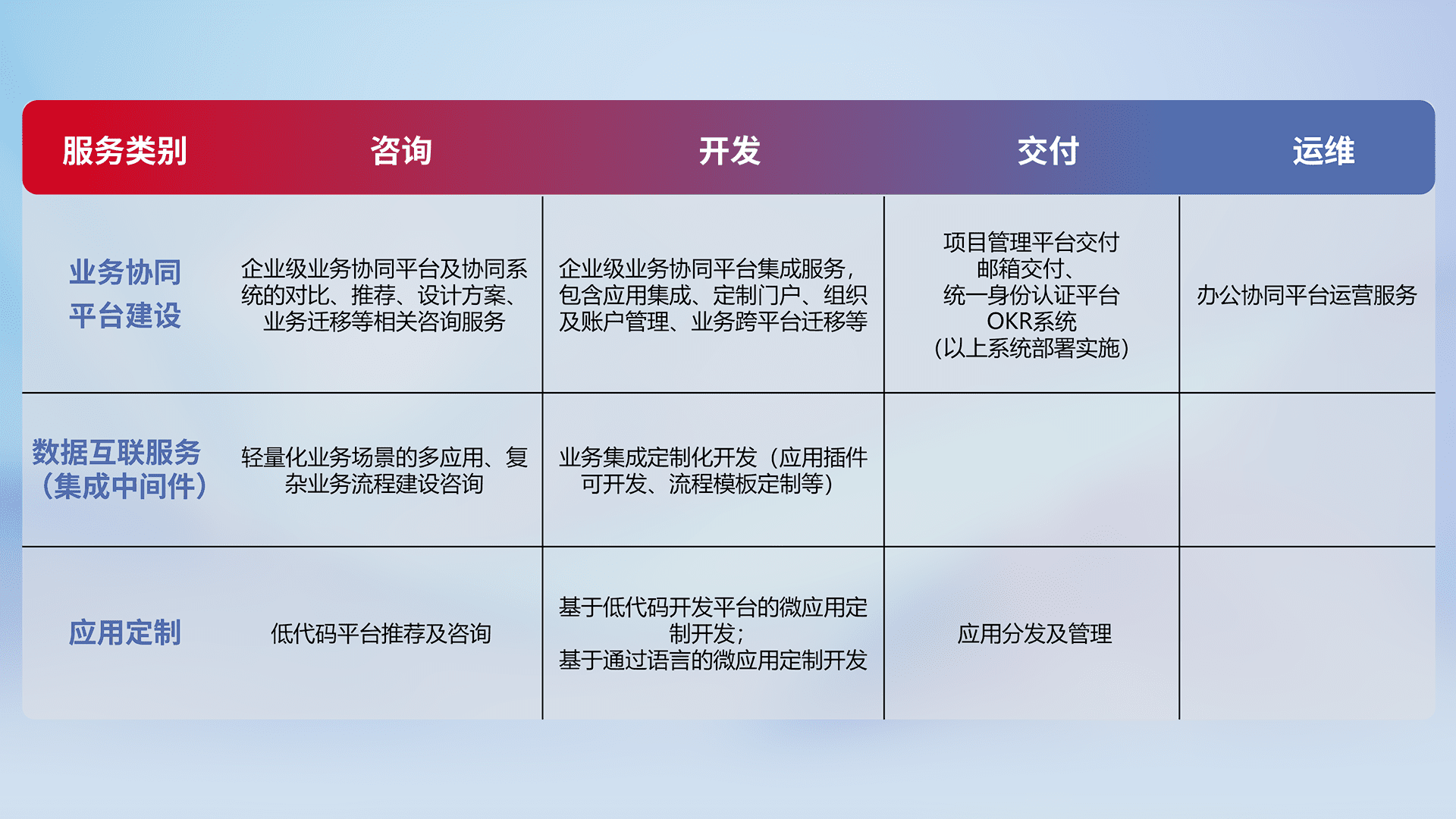 针对钉钉、、企微、、、IDaas等平台级产品提供产品的规划、、、方案、、、、交付、、定制化开发等服务,,,实现如统一协同办公、、、智能客户服务、、、、混合会议管理、、、、智能数据查询、、等业务场景,,实现数字化转型。。。。